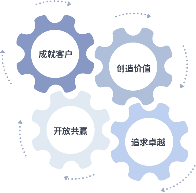 成就客户是一切决策的出发点,,,,创造价值是衡量所有工作的标准,,追求卓越是我们做事做人的态度,,,,开放共赢是我们的格局也是最终的结果。。。价值观的齿轮环环相扣,,,,推动着组织里的每个人不断向前。。。